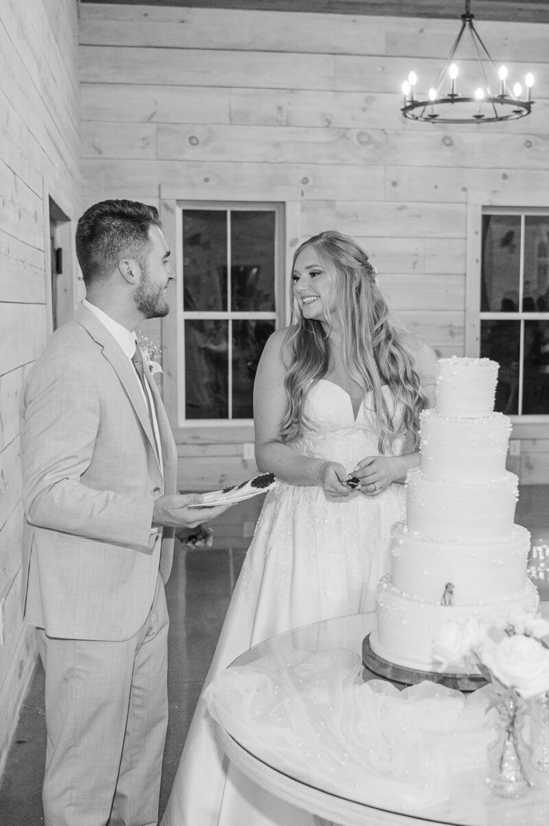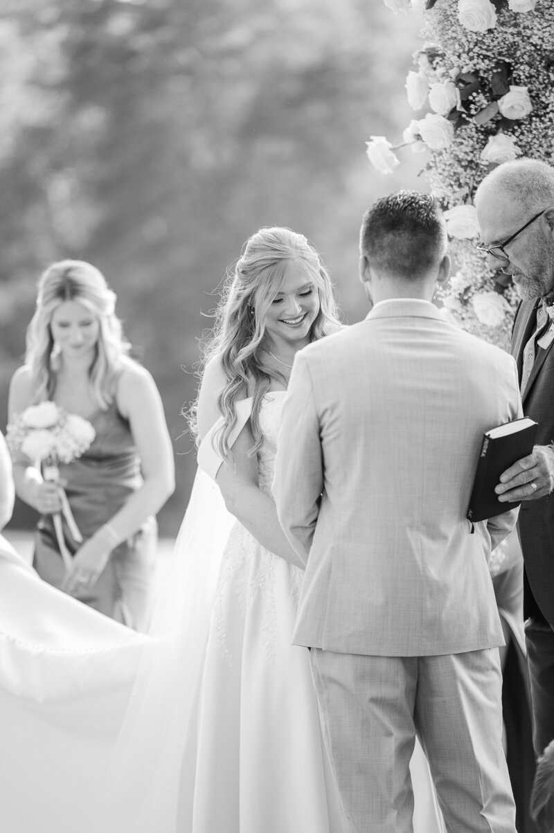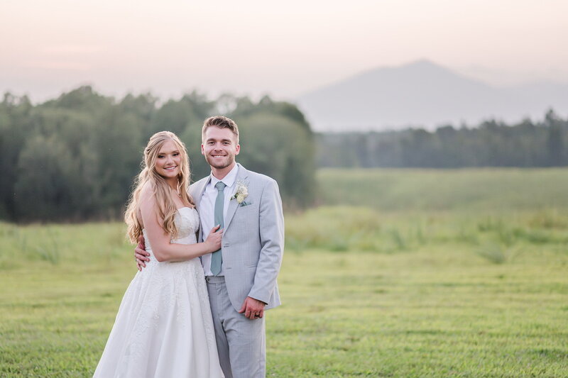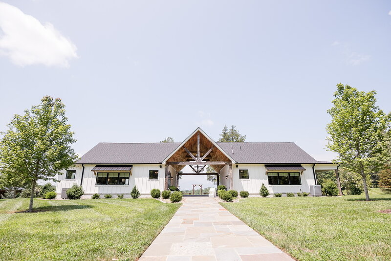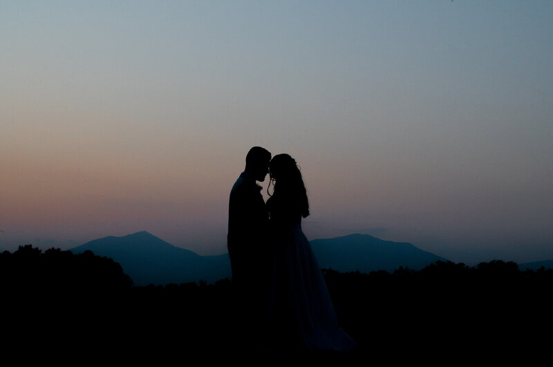 Set against the breathtaking backdrop of the Blue Ridge Mountains, their 5PM ceremony was dreamy from beginning to end. The arbor was adorned with white roses, lush greenery, and baby’s breath, beautifully arranged by Harvest Studio. The look was soft, romantic, and perfectly suited to the setting.